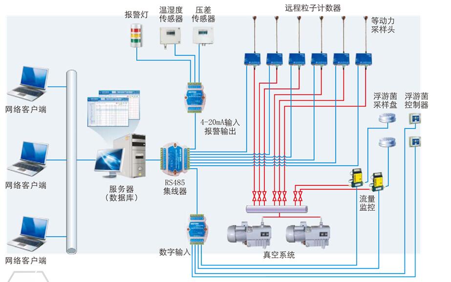 該系統(tǒng)主要承擔(dān)用戶生產(chǎn)區(qū)在線塵埃粒子監(jiān)測系統(tǒng)的定義、實施和測試。該遠程粒子監(jiān)控系統(tǒng)設(shè)計為具有以下主要功能:
